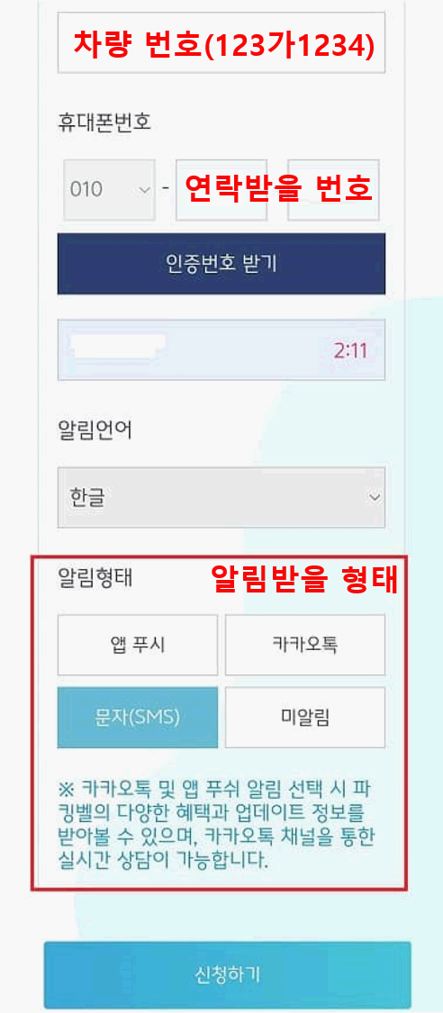 5. 차량번호 (전체) / 핸드폰 번호 / 알림형태 입력 후 신청하기