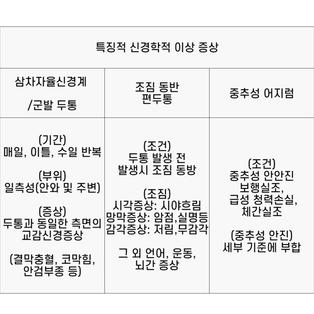 (두통 포함 삼차자율신경계 두통, 편두통, 중추성 어지럼)