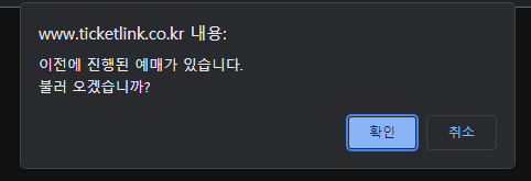 예매창 닫힘 > 재접속 > 취소 선택하면 다시 좌석 선택부터 해야합니다.