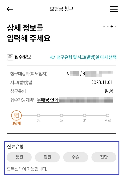⑦ 통원(진료) / 입원 / 수술 / 진단 중 선택합니다.