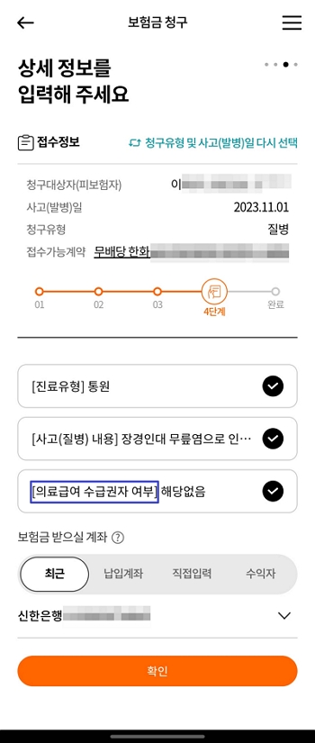 ⑧ 실손보험 납부 은행/계좌번호 입력 후 확인합니다.