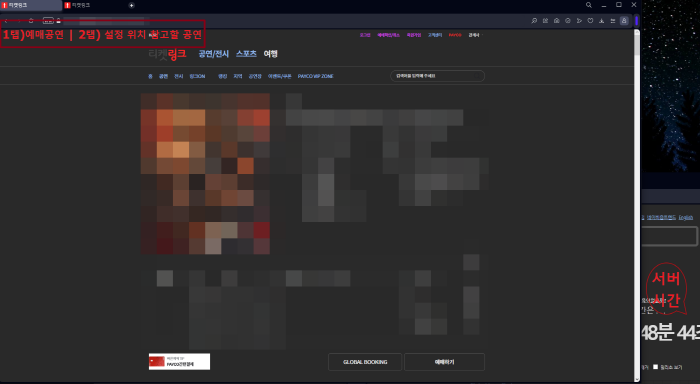 - 첫번째 탭에 원하는 예매 공연, 두 번째 탭에 위치를 봐둘 예매창을 띄워놓고